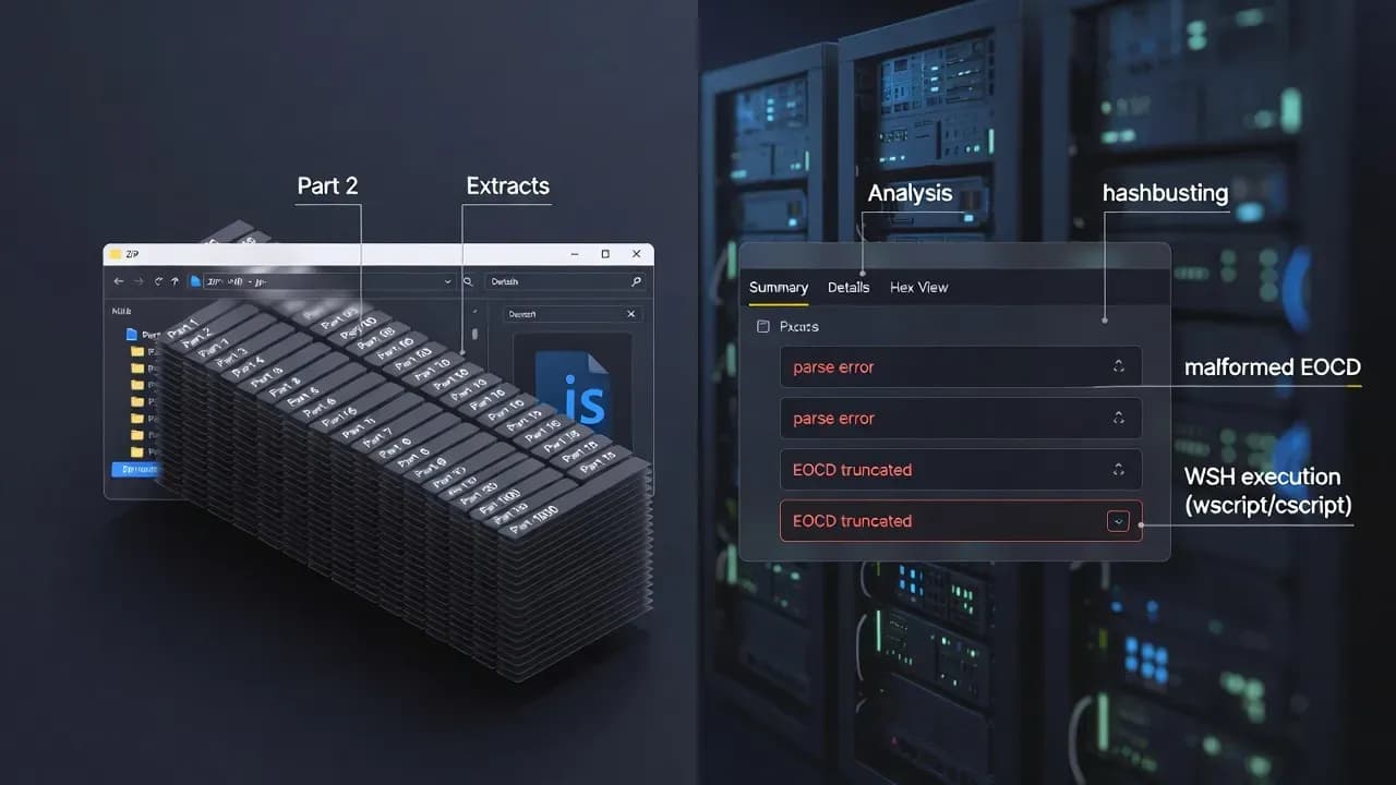 At a high level, the new approach looks deceptively simple: a victim downloads a ZIP archive that contains a JScript payload, and the script launches via Windows Script Host. But under the hood, the ZIP is engineered as an adversarial object. Instead of a single valid archive structure, it is constructed by concatenating an unusually large number of ZIP archives back-to-back, typically in the range of several hundred and potentially reaching one thousand parts. This exploits how ZIP parsers commonly read from the end of the file to locate directory records. In practice, the archive "works" for Windows Explorer while failing for many third-party tools that incident responders and automated scanners depend on. The operator gets the best of both worlds: a user-friendly extraction path for the target and an unfriendly extraction path for defenders.