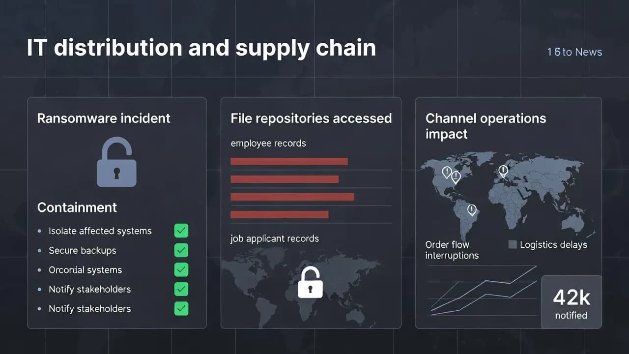 The Ingram Micro ransomware breach is a reminder that breach impact cannot be measured only by the number of people notified. Ingram Micro says a July 2025 attack exposed files tied to employee and job applicant records, triggering notifications to roughly 42,000 individuals. But Ingram Micro is not just another company dealing with ransomware. It sits in the middle of the global IT channel, and when a distributor's systems go down, operational shockwaves can hit vendors, resellers, MSPs, and downstream customers who rely on ordering, licensing, and provisioning platforms to function. The strategic risk is clear: attackers increasingly target high-dependency intermediaries because even short disruptions can translate into real revenue loss, stalled deployments, and a long tail of identity and fraud exposure.