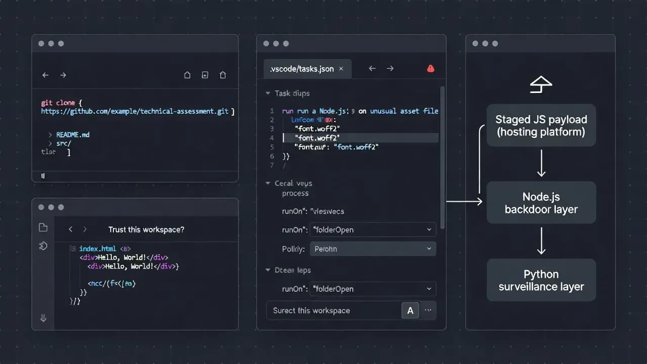 Researchers observed repos embedding a task configured to run automatically whenever the folder is opened. In practice, it can execute Node.js against a disguised payload (for example, JavaScript masquerading as a font-like file) and bootstrap the next stages.
